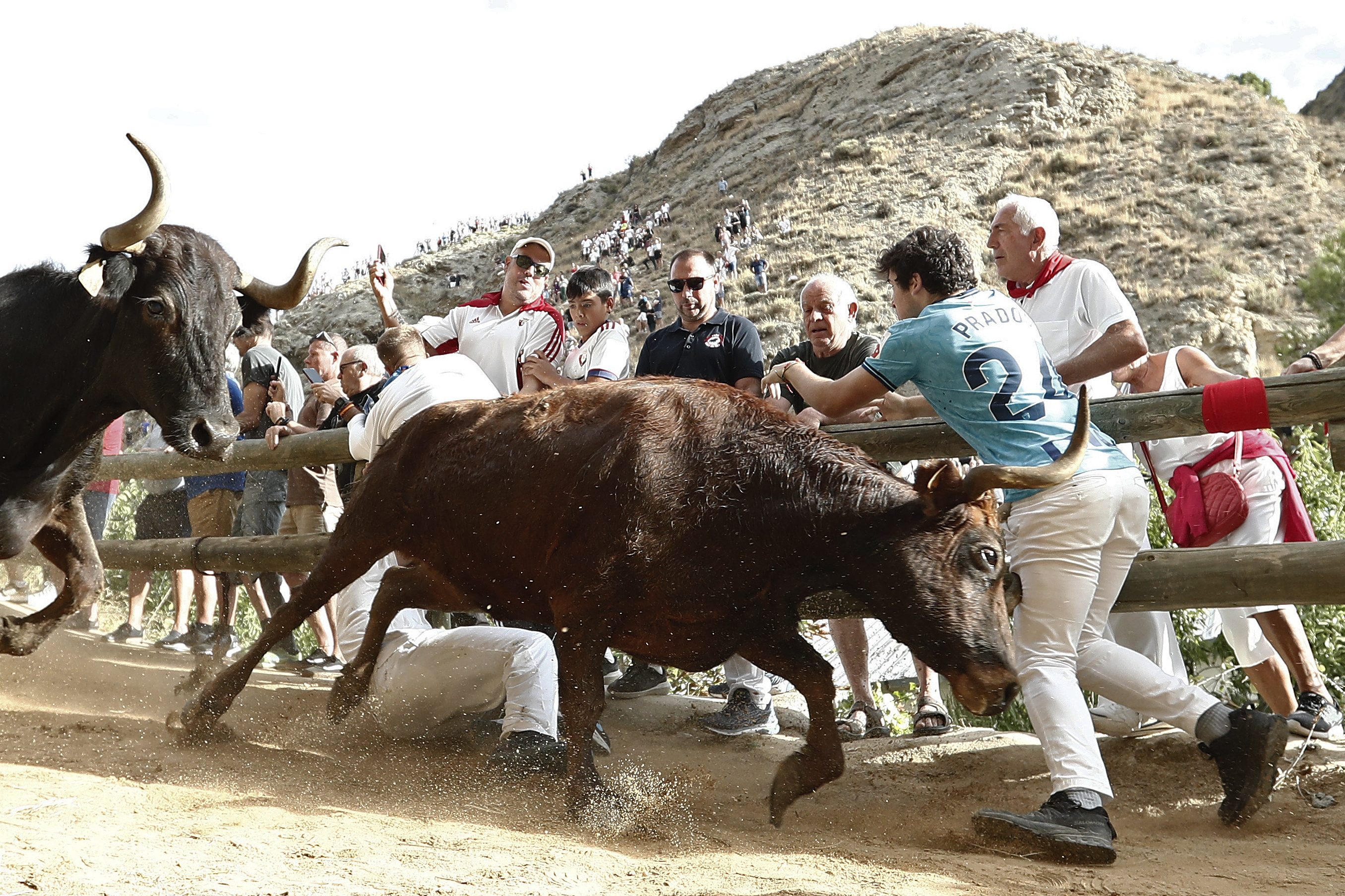 Con las laderas del monte repletas de público expectante ante uno de los actos más peculiares y también de riesgo para el público en el verano festivo en Navarra, el corral donde aguardaban las 10 reses del ganadero local se ha abierto puntual a las 9:00 horas para completar la tradición de realizar una carrera, habitualmente vertiginosa, cuesta abajo hasta el casco de Falces.