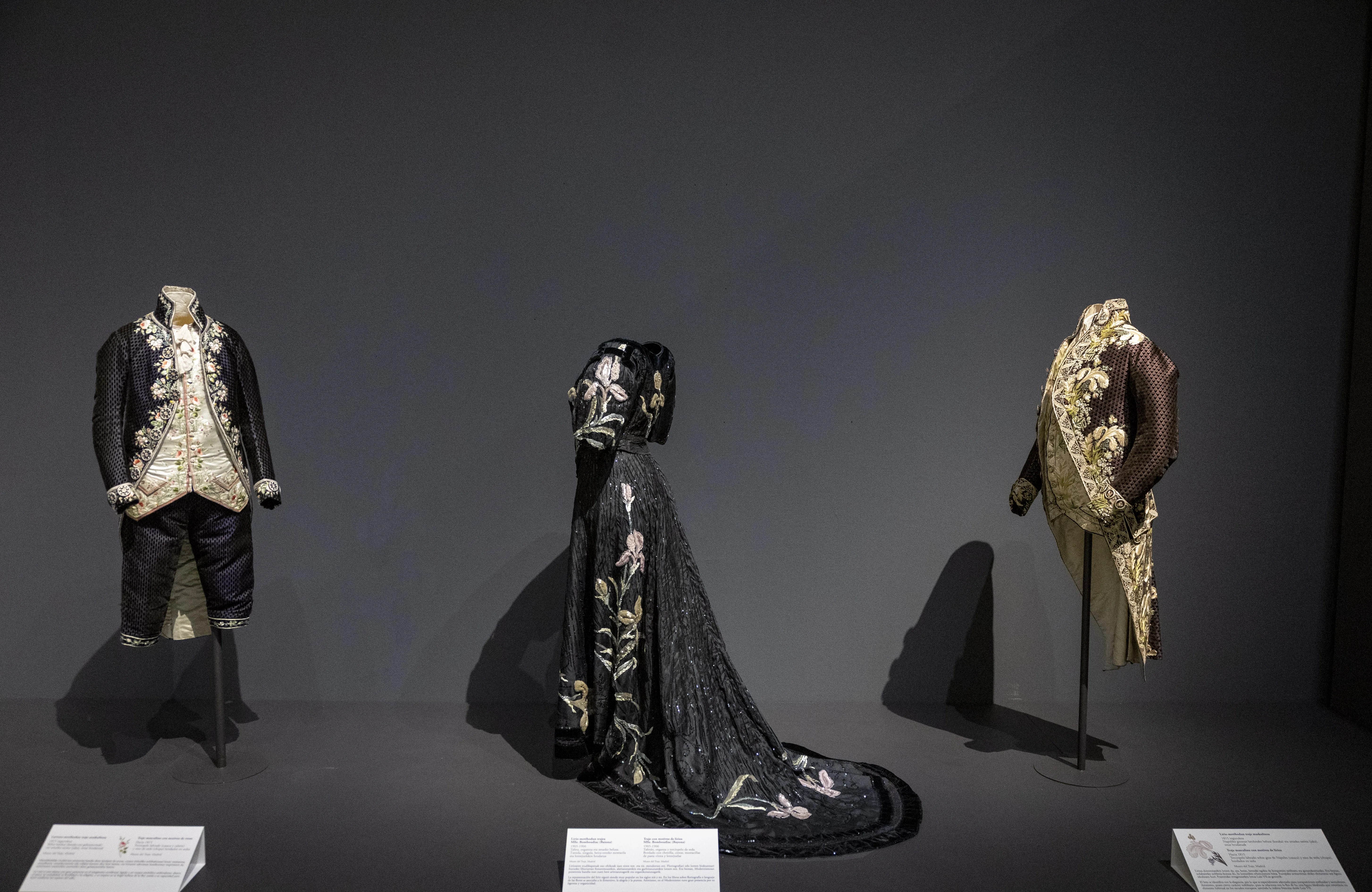 Motivos florales y vegetales, bordados o estampados, se suceden en cada uno de los objetos y vestimentas expuestos -conjuntos de dos piezas, casacas, faldas, jubones, e incluso alguna casulla y prenda religiosa-.